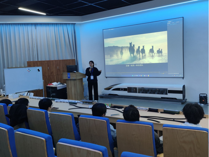 活动伊始,王文月开展轨道交通科普讲座,结合科研实践与工程案例,介绍我国铁路发展概况、轨道交通系统构成及相关科研方向,使同学们对轨道交通工程的整体技术体系形成初步认识。随后,在铁路园参观环节,王文月围绕蒸汽机车、内燃机车与电力机车的动力原理与应用背景进行讲解,引导学生通过实物对比理解铁路装备的发展脉络,拓展同学们对轨道交通技术应用与研究方向的认识。