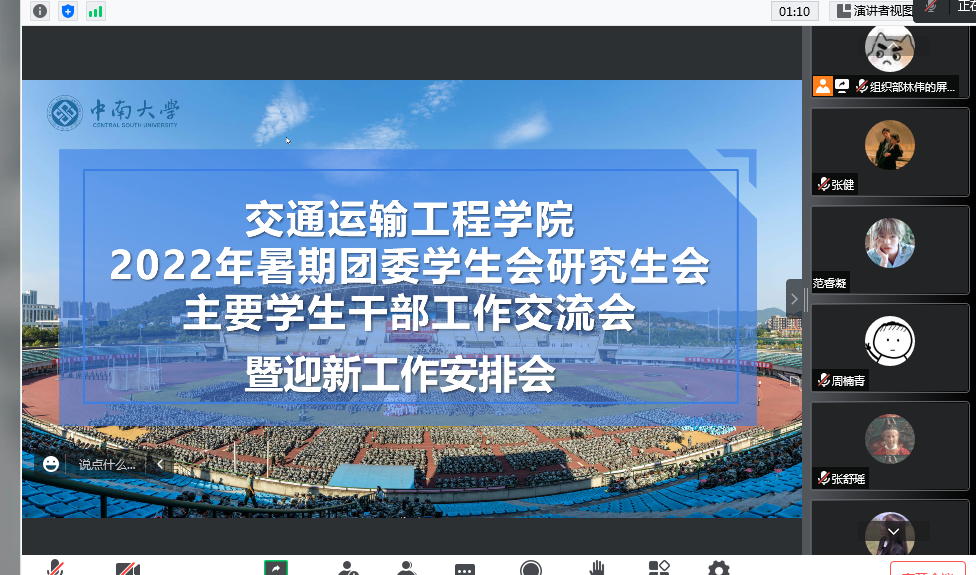 2022年8月24日下午3点,中南大学交通运输工程学院2022年暑期分团委、学生会、研究生会主要学生干部工作交流会暨迎新工作安排会于线上顺利举行,会议由分团委组织部林伟主持,团委副书记张健老师和郑繁简老师、2022级...