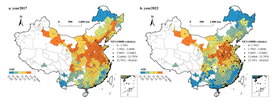 2.城市交通与可持续发展:研究发现2017-2022年期间,随着各城市新能源汽车的推广,各城市平均空气质量指数均呈下降趋势,新能源汽车对空气质量指数产生显著负效应。研究发现居家办公使市内出行强度降65%,空气质量指数改善26.3%,五类污染物浓度显著下降。为未来城市可持续战略发展指明了重要方向。