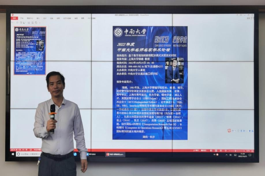 10月25日上午,由交通运输工程学院承办的中南大学名师名家学术论坛报告在铁道校区交通楼425顺利举办。本次报告邀请到上海大学管理学院院长镇璐教授担任主讲人,其报告题目为:基于数学规划的新型配送模式决策优化研究。镇璐教授在港口航运物流系统、多式联运、物流配送优化理论与方法等方面学术造诣高、研究成果丰富。