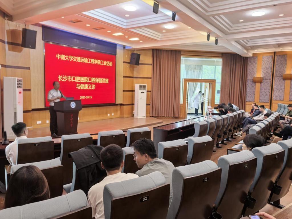 参观结束后,中南大学交通运输工程学院党委副书记、工会主席李苑组织介绍了长沙市口腔医院口腔保健讲座与义诊活动。长沙市口腔医院口腔综合党支部和行政后勤第二党支部组成的专家团队为中南大学师生带来了一场干货满满的口腔健康讲座。这支队伍阵容强大,由口腔综合党支部书记、五一路院特诊中心主任张敬阳带队,友谊路院口腔急诊综合科副主任武甲子、新大新门诊部口腔综合科副主任马飞、友谊路院特诊中心副主任朱毅男等多位知名专家组成。讲座内容涵盖口腔常见疾病防治、前沿治疗技术及日常保健知识,针对教师长时间讲话及长期伏案工作给出了口腔护理专业建议,现场互动热烈,笑声与掌声不断。