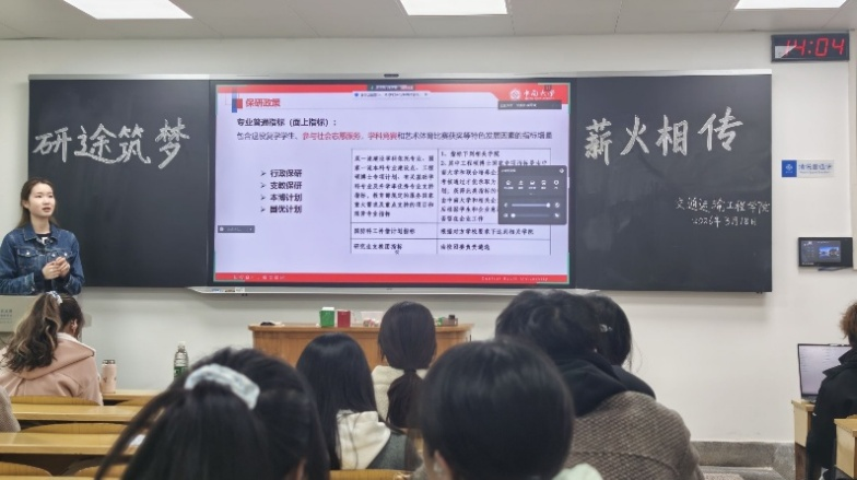 为帮助我院学子明晰保研方向,提升综合竞争力,科学规划学业与升学发展,中南大学交通运输工程学院学生会学习部于3月18日下午在天心校区A103举办交流铸翼,成长沙龙——“研途筑梦,薪火相传”保研经验分享会。本次活动邀请了三位经验丰富的学姐担任分享嘉宾,吸引了各年级同学踊跃参与。