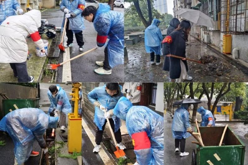 此次志愿服务重点针对社区内部分排水沟进行集中清理。受连续降雨影响,排水沟内堆积了大量落叶、垃圾与淤泥,不仅影响排水效率,也存在一定安全隐患。志愿者们手持铁锹、扫帚、垃圾袋等工具,分工协作、默契配合,认真清理沟内杂物,疏通堵塞点位。雨水打湿了衣衫,却丝毫没有影响大家的干劲,同学们不畏泥泞、不惧风雨,坚守在志愿服务一线。