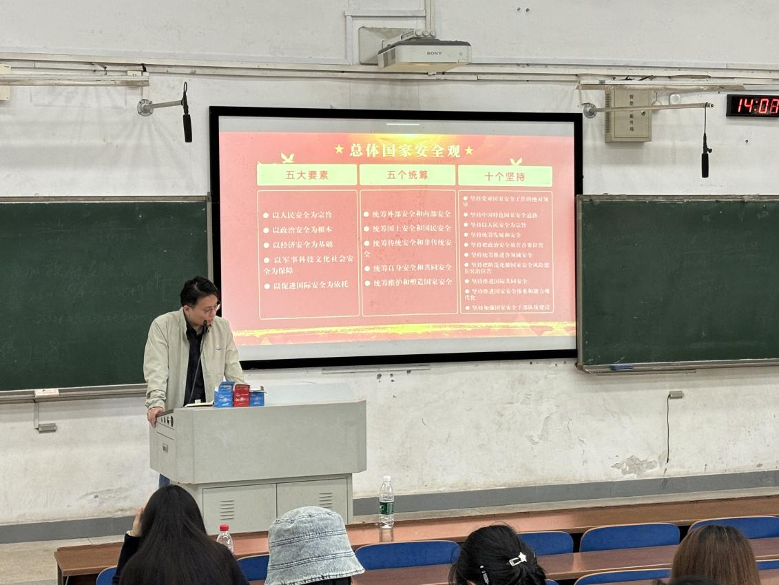 随后,蔡老师从什么是国家安全、什么是国家安全意识、总体国家安全观的提出、总体国家安全观的内容四个方面展开讲述,进一步加深了同学们对总体国家安全观的理解,也更加凸显国家安全对于国家发展的重要性。