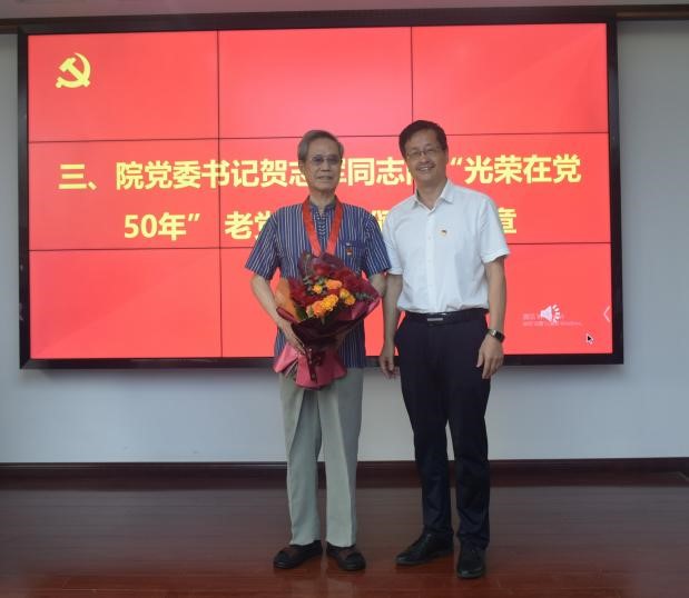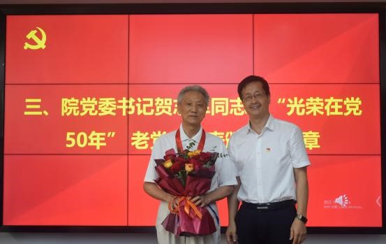 随后,院党委书记贺志军向“光荣在党50年”老党员颁发纪念章,并同他们亲切握手、表示祝贺,青年党员向纪念章获得者献上美丽的鲜花,全场响起一阵阵热烈的掌声。贺书记代表学院向获得者表示热烈的祝贺、致以崇高的敬意。受到表彰的老党员身上生动体现了中国共产党人坚定信念、践行宗旨、拼搏奉献、廉洁奉公的高尚品质和崇高精神。