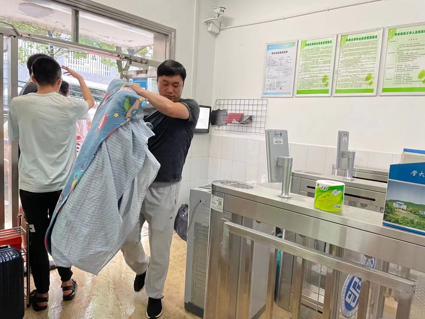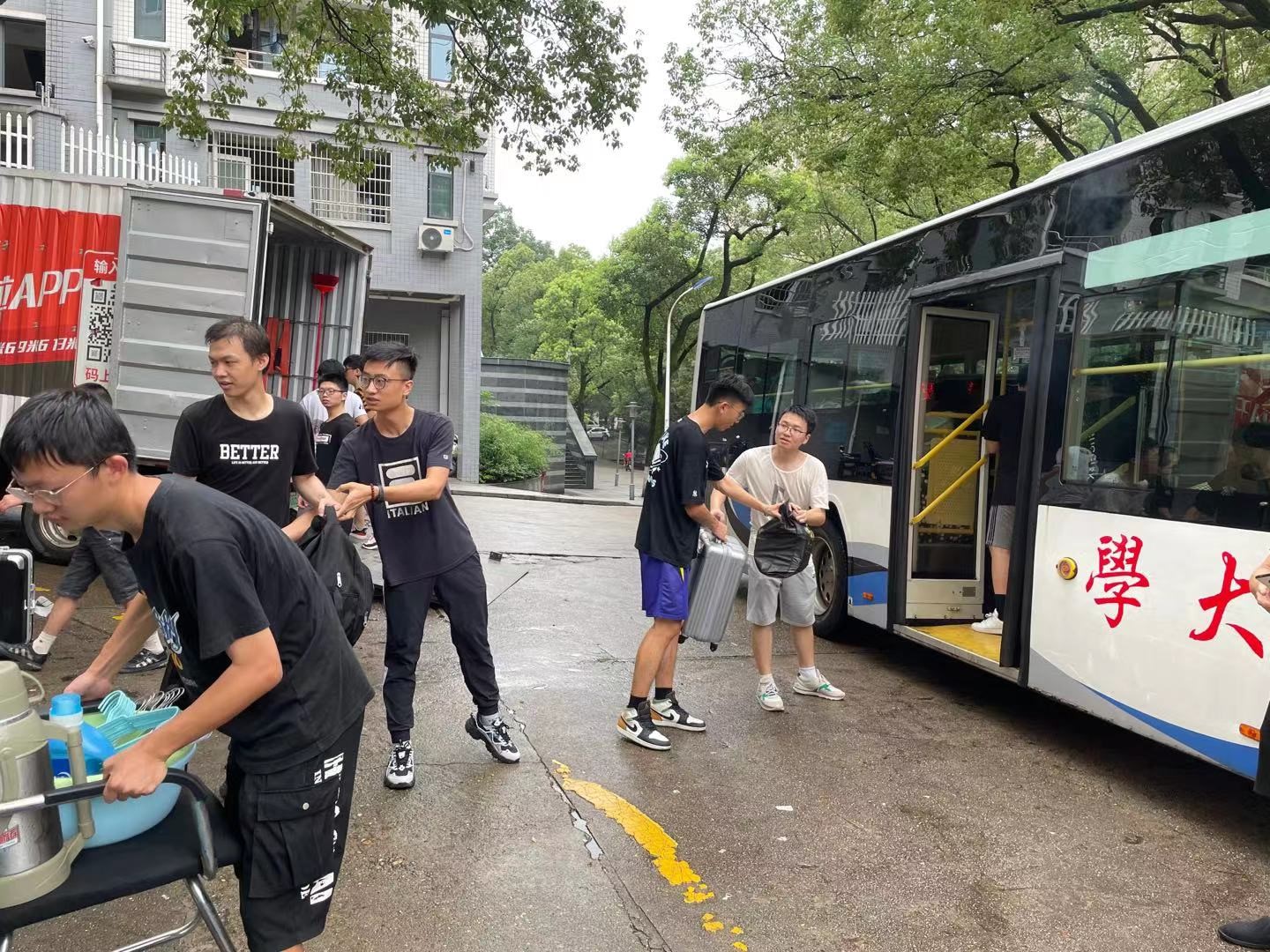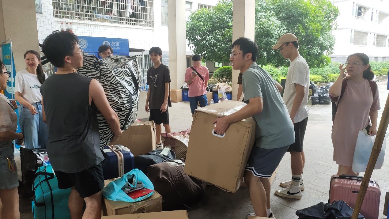 恰逢长沙梅雨季节,天公不作美,在本次搬迁工作过程中两次下起瓢泼大雨,然而,为避免学生们的物品免遭破坏,全体指导老师和志愿者们面对恶劣天气毫不退缩,仍然没有停下忙碌的身影。学院党委副书记宋晓东带头启动紧急预案,冲在搬迁工作第一线,全体辅导员和18级志愿者互帮互助,秉持着强烈的责任心,确保了19级学生行李物品即使归寝。