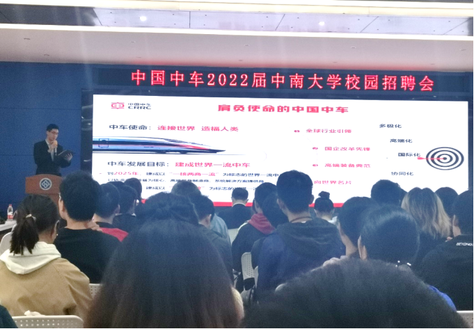10月15日上午十点,中国中车在中南大学铁道学院立志厅举行了2022届校园专场招聘会。本次招聘会包括现场宣讲环节与面试环节。
