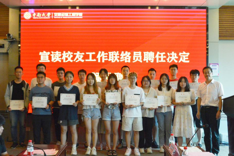 座谈会结束后,贺志军书记为校友工作联络员颁发聘书,并对本次会议进行总结发言。他表示,非常感谢同学们对学院的建设发展提出的建议,学院会逐条分析,将其应用到今后的学习发展中去。同时,作为学院联系校友的桥梁和纽带,希望校友工作联络员能使学院成为同学们今后在社会或在学习中成长的助力。会议最后,全体与会人员到交通楼门口合影留念。