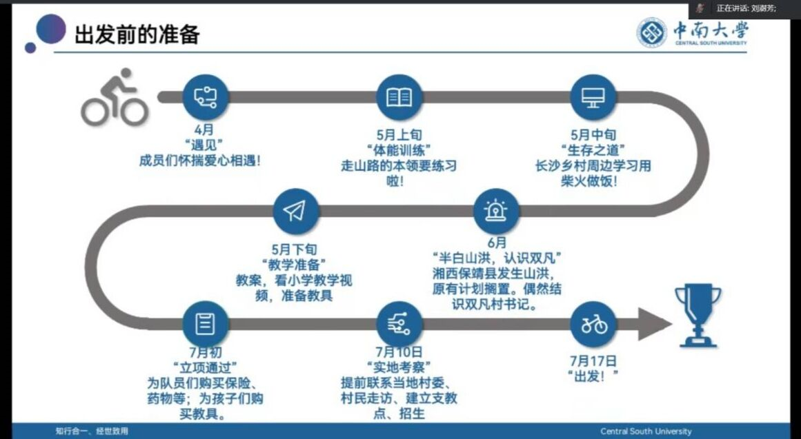 7月8日晚20:00,为落实暑期社会实践相关要求,助力同学们在社会实践中长才干、增本领,出成果,交通运输工程学院以线上形式顺利举办2022年暑期社会实践行前培训会。交通院团委副书记张健老师、郑繁简老师和交通院各暑期社会实践团队参加了本次会议。会议邀请了2021年中南大学赴株洲攸县双凡村志愿支教团队长刘澍芳同学、交通院新闻宣传中心记者团部长李欣语同学分别分享了实践、宣传心得与经验。本次会议由苏文心同学主持。