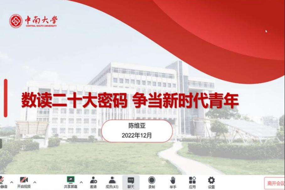 12月28日下午16:30,学院党委委员、副院长陈维亚教授线上带领交通运输与物流工程学生党支部、博士研究生第六党支部开展了“数读二十大密码,争当新时代青年”主题党课。此次党课由交通运输与物流工程学生党支部书记张佳琪老师主持,两个党支部全体同志参加。