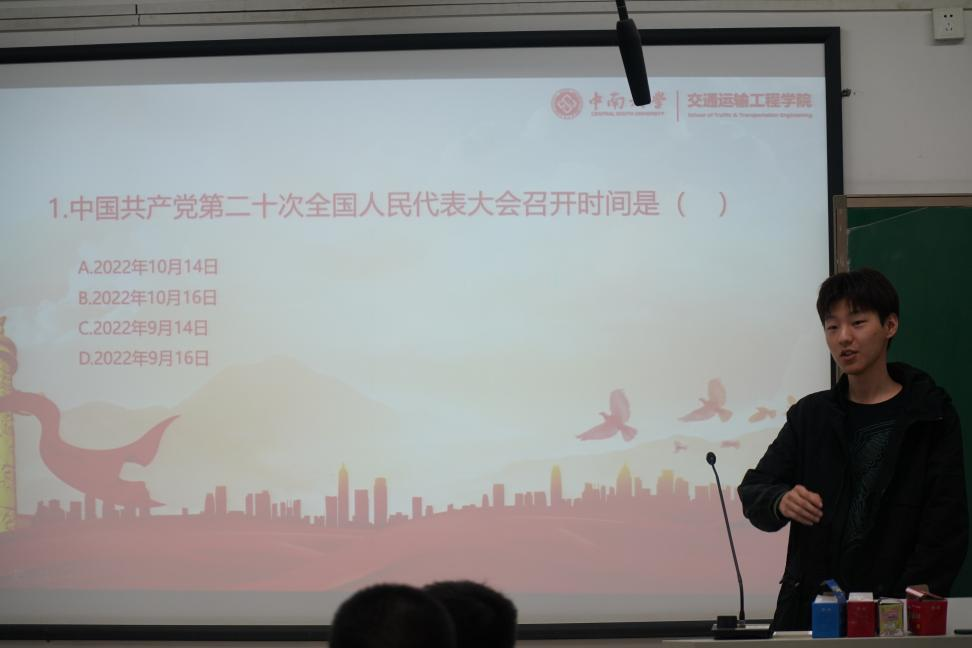 接着,社会实践中心副部长庄明宇围绕二十大报告中的重点知识组织“互动回答”,内容涵盖党的二十大报告、习近平总书记系列重要讲话精神等,在抢答环节中,同学们积极参与,现场气氛热烈。