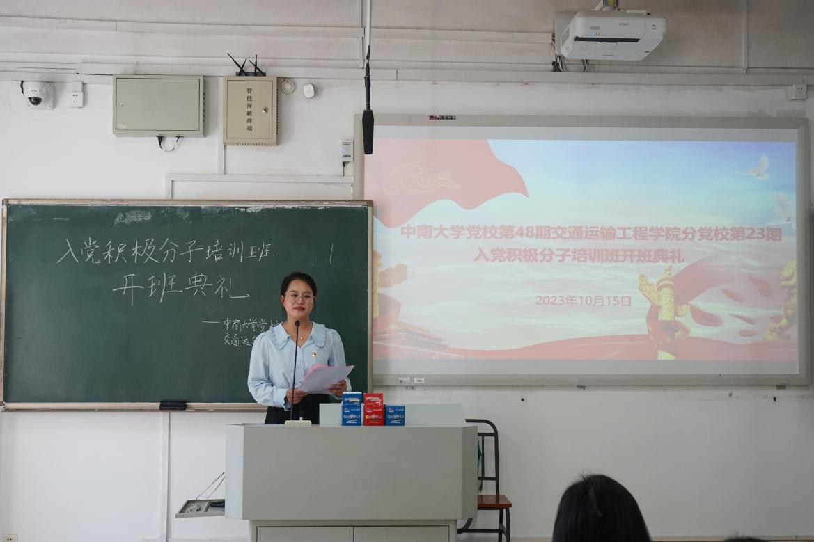 10月15日下午15:00,中南大学党校第48期、交通运输工程学院分党校第23期入党积极分子培训班开班典礼于新校区A座108教室顺利举行。交通运输工程学院党委副书记李苑,中南大学党校督导老师张国平,交通运输工程学院学工办副主任张佳琪,入党积极分子培训班班导师王尚君以及本期培训班全体学员参加了此次开班典礼,典礼由王尚君老师主持。