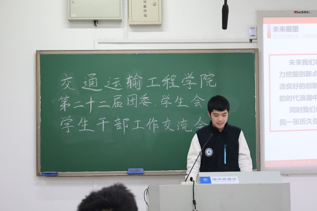 会议伊始,院党委副书记李苑致辞。他指出,团委、学生会全体学生干部应积极锻炼自己,服务同学,守正创新,在实干中切实增强工作能力;坚定不移听党话、跟党走,做同学们的知心人,做同学与老师、学院之间的桥梁和纽带;传承贯彻优良的工作经验并发扬光大。他强调,交院同学的自豪感、集体荣誉感来自所有人的共同努力,学生干部要时刻牢记自身使命,为交通院的发展贡献自己的力量