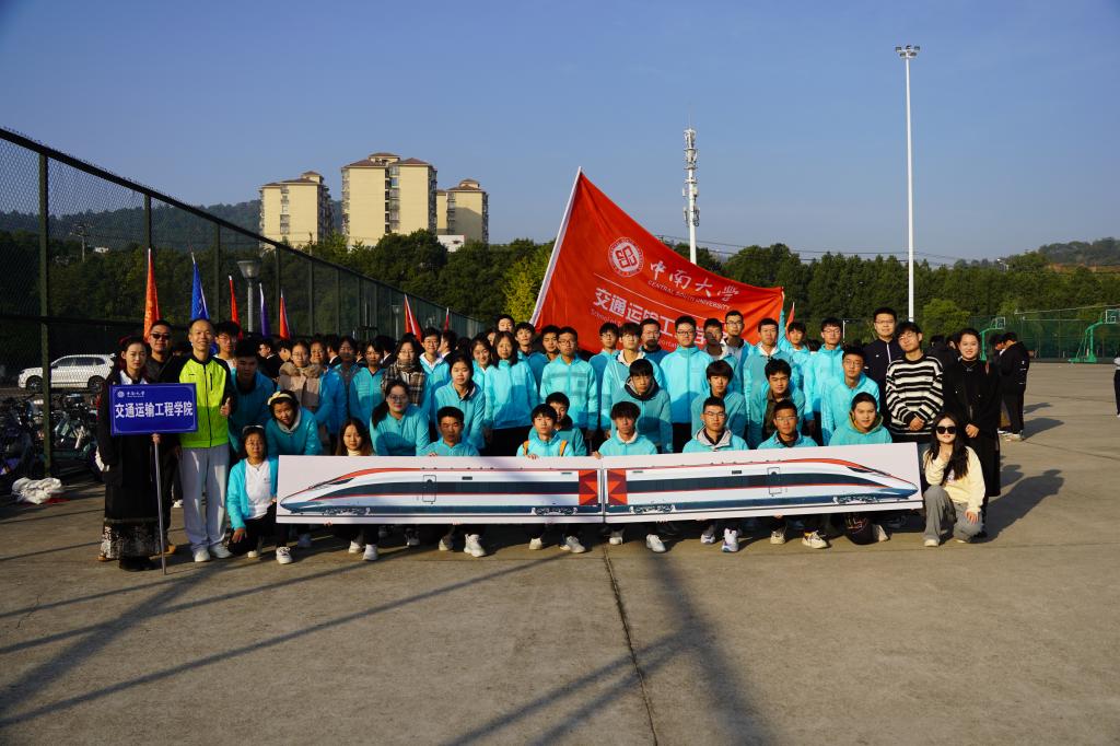 随着《运动员进行曲》在体育场内响起,各个学院的运动员方阵入场表演。踏着音乐的鼓点,交通运输工程学院的运动员方阵迈步走来。红色旗帜迎风飘扬,运动员们统一着装,大步向前,展现出交院学子不畏困难、敢于挑战的风采;运动员手持展示中国高铁的方牌,彰显着交院学子对交通强国的不懈追求以及踔厉奋发、报效祖国的决心。
