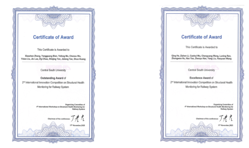 我院科研团队在第二届轨道交通结构健康监测国际创新大赛获杰出奖、卓越奖等多项佳绩