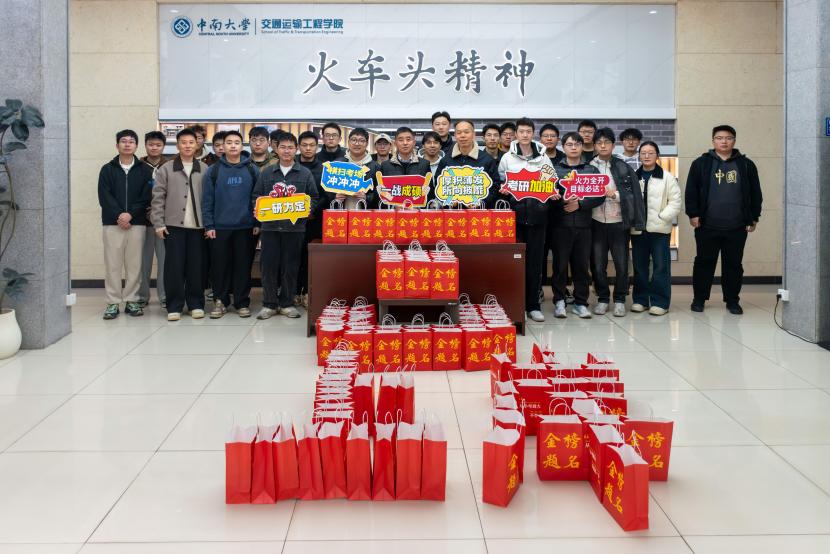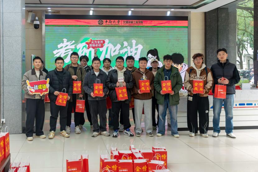 12月15日11时,中南大学交通运输工程学院在交通楼一楼大厅举行考研学子慰问活动。学院党委书记袁世平、党委副书记李苑、辅导员张健、蔡明旭、阮琼参加活动,为即将奔赴考场的学子们送上精心准备的“金榜题名”考研礼包及诚挚祝福。