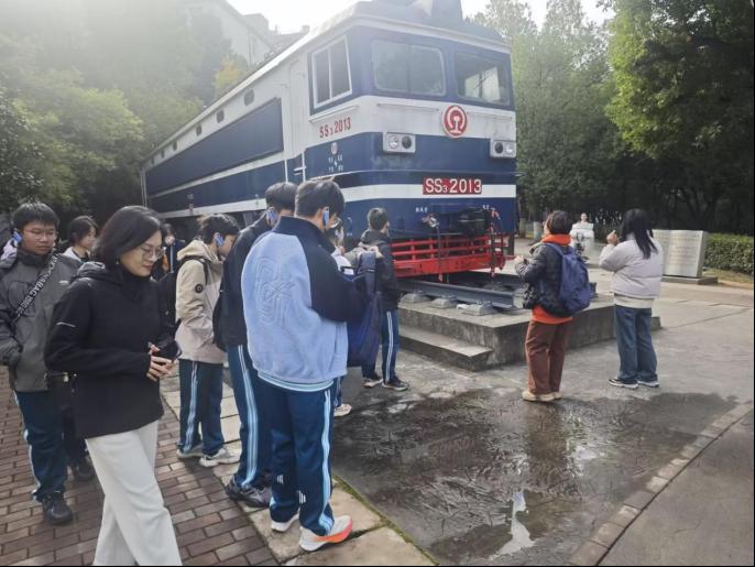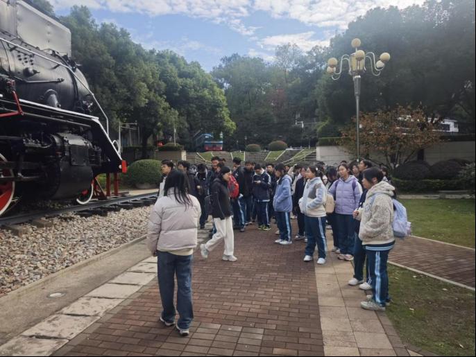 紧接着,师生一行在朱爱媛的带领下走进铁路园。这里陈列的真实比例轨道、列车,让同学们仿佛穿越时空,近距离触摸轨道交通的发展印记。朱爱媛结合实物,详细讲解了轨道铺设原理、信号系统运作机制及列车部件的功能作用,还耐心解答了同学们关于“不同轨道类型的适用场景”“老式列车与现代高铁的技术差异”等疑问,让大家在实景观察中深化了对轨道交通基础常识的理解。