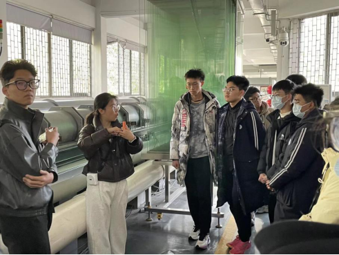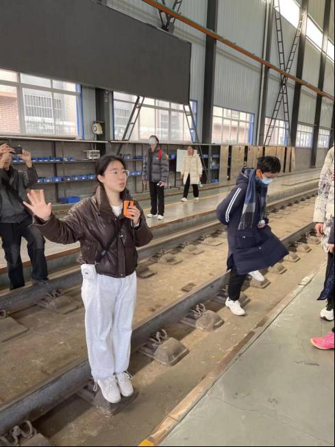随后,师生走进气动实验室,由志愿者王文月进行讲解,通过列车模型与实验设备,直观感受列车在高速运行过程中的空气动力学特征,激发了同学们对工程技术的浓厚兴趣。在碰撞实验室,同学们参观了碰撞试验台,了解其在列车安全性能测试中的重要作用。王文月重点介绍了试验台的创新功能,让大家认识到轨道交通装备在安全性能方面的严谨设计。