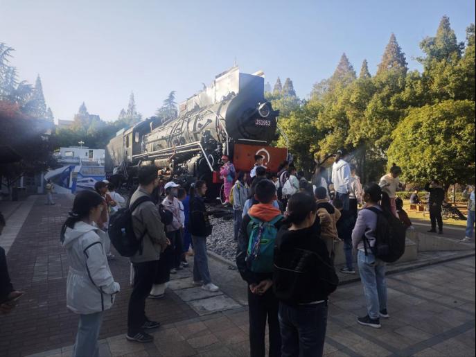 活动开始,志愿者郭建国热情迎接师生团队,有序引导至科普教育区域。王琴通过多媒体与铁路园火车头实景,生动介绍了轨道交通发展历程与中南大学交通运输工程学院在轨道交通领域的成就,让大家身临其境地感受到“中国速度”的历史轨迹。