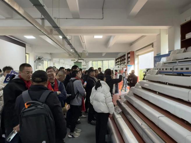 在气动实验室,讲解员介绍了高速列车空气动力学研究的主要内容与实验方法。参观校友重点了解了传统轮轨列车动模型试验台的结构布局及工作流程,包括加速段、试验段和制动段的功能划分,以及弹射加速、精密测试和复合制动等关键技术。通过动模型演示与讲解,校友们深入认识了列车高速交会、穿越隧道及侧向风作用下的空气动力学问题,了解了空气阻力、气动噪声和气动稳定性对列车运行性能与安全性的影响,对流线型车体设计和气动优化技术在高速铁路发展中的重要作用有了更加清晰的理解。