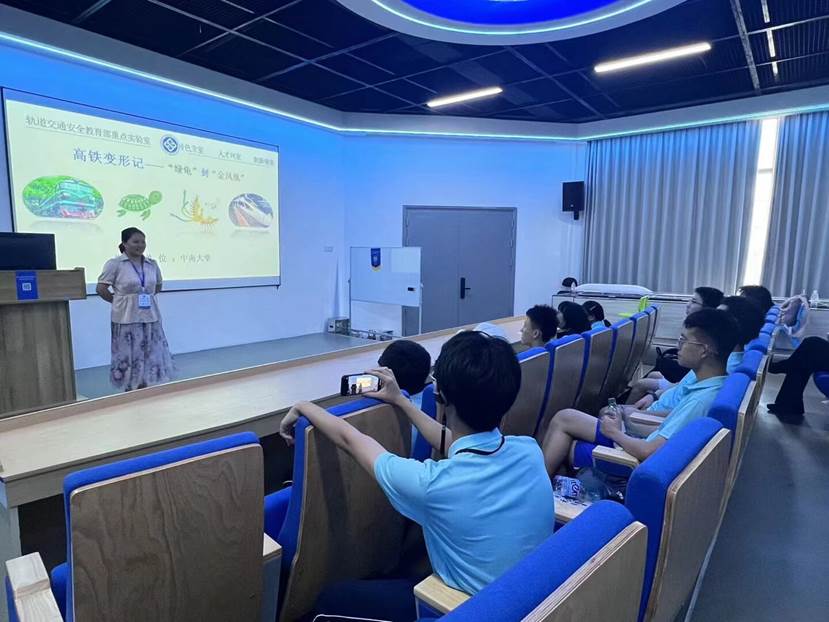 在基地讲解员的引导下,小记者们手持采访本,先后走访了记录时代车轮的铁路园、展现自主创新历程的轨道交通科普馆,以及科研氛围浓厚的动模型与实车碰撞实验室。他们不仅认真聆听讲解,更以“小记者”的身份踊跃提问,用笔记录下中国高铁从追赶到领跑的辉煌成就,深入探寻中南大学在速度提升、安全控制等核心技术领域背后的创新故事。